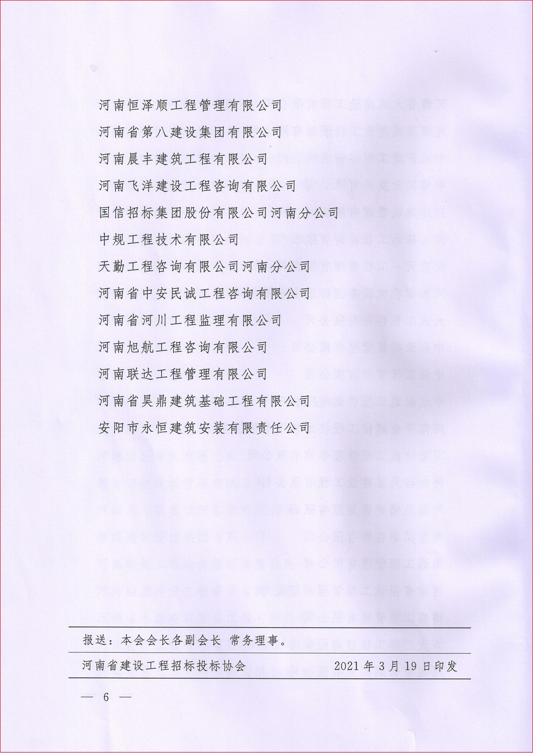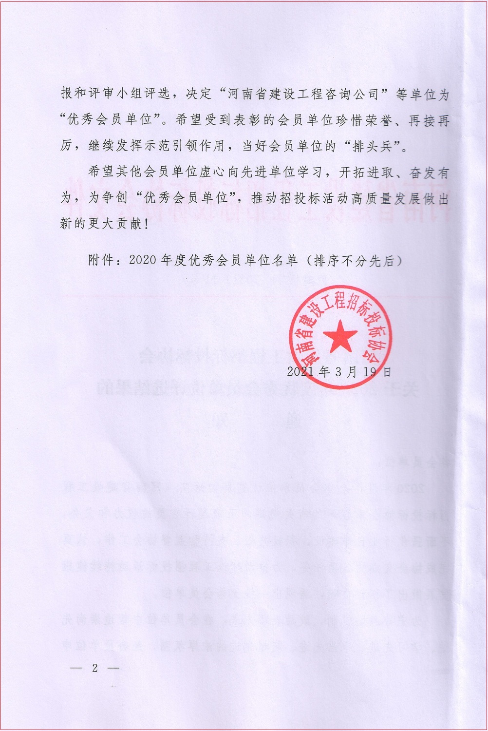 2021年3月,河南省建设工程招标投标协会发布“关于2020年度优秀会员单位评选结果的通知”,恭贺我公司获得“河南省建设工程招标投标协会2020年度优秀会员单位”,至此是公司连续三年获得河南省建设工程招标投标协会荣誉奖项。