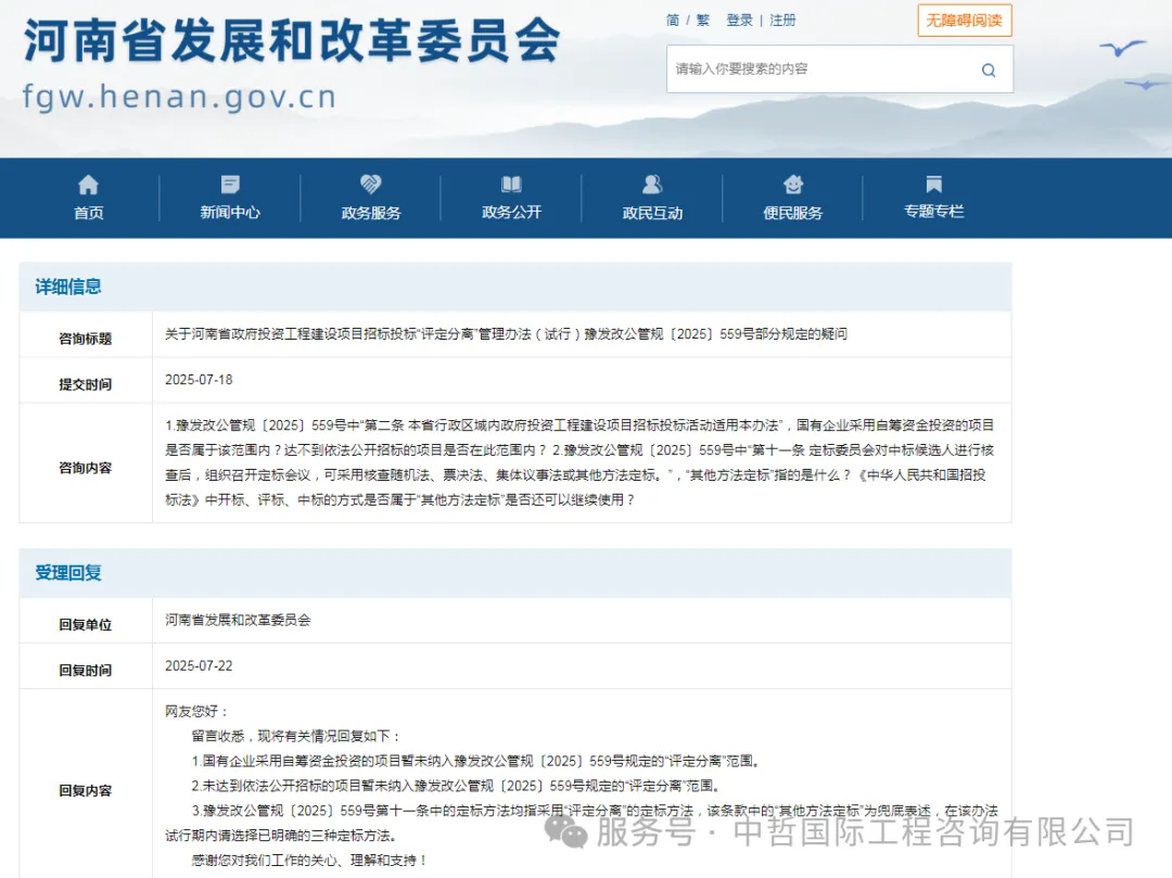 1.国有企业采用自筹资金投资的项目暂未纳入豫发改公管规〔2025〕559号规定的“评定分离”范围。