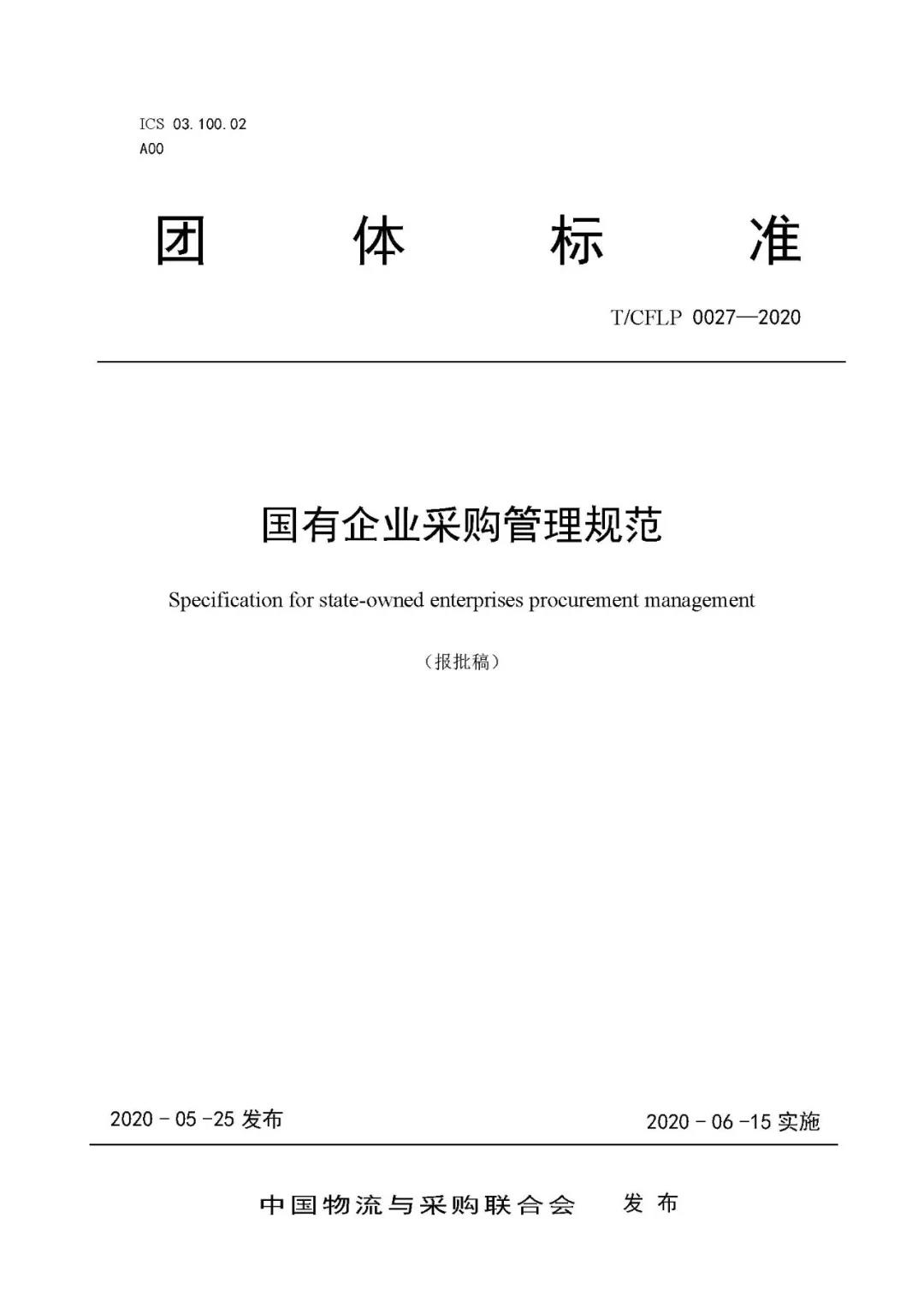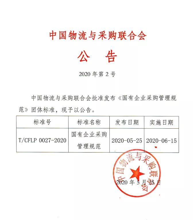 2020年5月25日,中国物流与采购联合会发布公告,正式发布《国有企业采购管理规范》团体标准,自2020年6月15日开始实施。